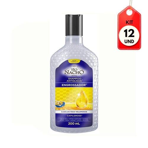 Kit C/12 Tio Nacho Engrossador Shampoo 200ml DESCRIÇÃO:Shampoo Engrossador Antiqueda Tio Nacho foi especialmente desenvolvido para quem possui os cabelos finos, quebradiços ou sem volume. Resultados eficazes desde o primeiro uso. AÇÃO/ATIVOS:Sua fórmula exclusiva combina Geleia Real com um composto de ingredientes de origem natural. Aumenta a espessura dos cabelos e tem ação antiqueda, para um cabelo mais forte, com menos quebras, mais volumoso e saudável. Possui eficácia comprovada no aumento da espessura dos fios, além de também fortalecer e revitalizar o couro cabeludo. Devolve o brilho e a força dos cabelos opacos e quebradiços. Imagem meramente ilustrativa. O produto pode ter variação de cor ou desenho, porém as características gerais são as mesmas especificadas na descrição do produto.MODO DE USAR:Aplique o shampoo nos cabelos molhados, massageando os fios bem, principalmente na raiz, em seguida enxágue abundantemente. Se necessário, repita o processo. ESTE KIT CONTÉM: 12 UNIDADES DE TIO NACHO ENGROSSADOR SHAMPOO 200MLKit C/12 Tio Nacho Engrossador Shampoo 200ml