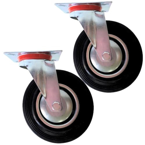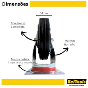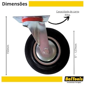 Diâmetro: 5" - 127mm. Largura da roda: 34mm. Capacidade de carga: 80kg. (Por Rodizio) Material: Borracha. Cor: Preto. Material da base: Chapa de aço zincada. Tipo do eixo: Com rolete.