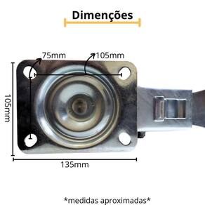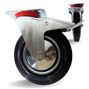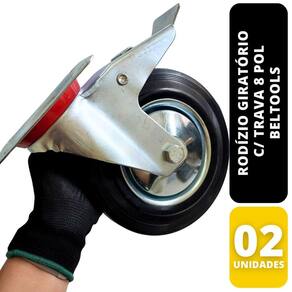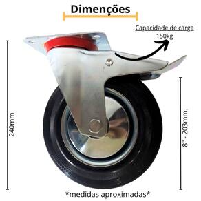 Diâmetro: 8" - 203mm. Largura da roda: 46mm. Capacidade de carga: 150kg. Material: Borracha. Cor: Preto. Material da base: Chapa de aço zincada. Tipo do eixo: Com rolete.