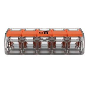 Conector de emenda; para condutores de até 4mm² com 5 entradas. Produto transparente e com alavancas laranjas. Temperatura máx. de operação 105ºC