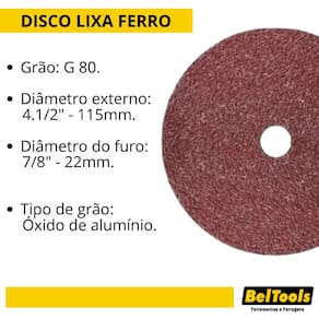 Grão: G 80. Diâmetro externo: 4.1/2" - 115mm. Diâmetro do furo: 7/8" - 22mm. Tipo de grão: Óxido de alumínio.