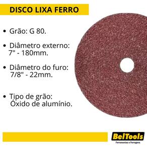 Grão: G 80. Diâmetro externo: 7" - 180mm. Diâmetro do furo: 7/8" - 22mm. Tipo de grão: Óxido de alumínio.