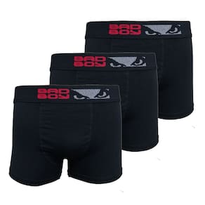 Kit contendo 3 cuecas Bad Boy modelo Boxer fabricada em Cotton 95% Algodão e elástico aparente personalizado de 40 milímetros. Modelagem jovem com lateral de aproximadamente 28 centímetros.
