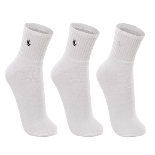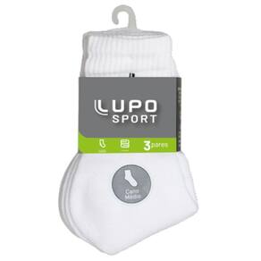Kit contendo 3 pares de meia esportiva Lupo atoalhadas de cano médio e com calcanhar verdadeiro. O tamanho M tem cano de 12 cm de altura e o tamanho G tem 14 cm de altura.