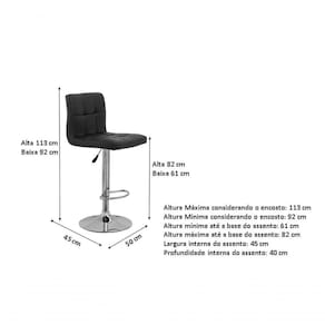 Altura Máxima considerando o encosto: 113 cm Altura Mínima considerando o encosto: 92 cm Altura mínima até a base do assento: 61 cm Altura máxima até a base do assento: 82 cm Largura interna do assento: 45 cm Profundidade interna do assento: 40 cm