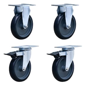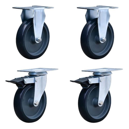 "Kit com 4 Rodas para Cargas Leves - Resistente à Corrosão, Maciez e Conforto, com Trava de FreioEste kit contém 4 rodas de alta qualidade, sendo 2 rodas fixas de PVC e 2 rodas giratórias com trava de freio. São ideais para uso em móveis e acessórios de utilidades comerciais, industriais e centros logísticos, proporcionando resistência à corrosão, boa mobilidade, baixo ruído, maciez e conforto, além de não marcar o piso.Características:Rodízios Fixos de PVC:Composição da roda: PVC preto, com furo passante de 5/16"".Dureza da roda: 65 Shore D (-20°C a 70°C).Garfo em aço com 2,65mm de espessura, acabamento zincado branco e dupla pista de esfera.Diâmetro da roda: 4 polegadas.Largura da banda: 1 1/4 polegadas.Capacidade de carga: 70kg por rodizio.Cor: Preto.Altura total: 108mm. Rodízios Giratórios com Trava e Freio:Composição da roda: Banda em borracha termoplástica (PVC cinza), núcleo em polipropileno, furo passante (cinza).Dureza da roda: 75 Shore A (-10°C a 50°C).Garfo em aço com 2,65mm de espessura, acabamento zincado branco e dupla pista de esfera.Diâmetro da roda: 4 polegadas.Espessura: 3/4 polegadas.Peso total suportado: 65kg por rodizio.Cor: Preto.Altura total: 4 polegadas.Capacidade de carga: Até 80kg por rodizio.Garantia 12 meses Conteúdo da Embalagem:2 Unidades de Roda Fixa Ref.: COLSON-FLP.412.BP.FP (capacidade de 70kg por rodizio) 2 Unidades de Roda Giratória com Trava de Freio Ref.: COLSON-GLPF.412.BP.FP (capacidade de até 80kg por rodizio)Com este kit de rodas, você terá 2 rodas fixas de PVC e 2 rodas giratórias com trava de freio, proporcionando versatilidade, mobilidade e segurança para suas necessidades. As rodas são projetadas para cargas leves, oferecem maciez e conforto durante o uso, garantindo a qualidade e durabilidade do produto."