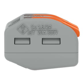 Conector de emenda; para condutores de até 4mm² com 2 entradas. Produto cinza e com alavancas laranjas. Temperatura máx. de operação 85ºC