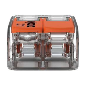 Conector de emenda; para condutores de até 6mm² com 2 entradas. Produto transparente e com alavancas laranjas. Temperatura máx. de operação 105ºC