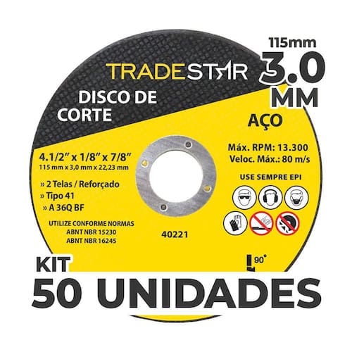 Kit c/ 50 Unidades Disco de Corte Metal 115x3,0 mm Furo 22/23 mm O Disco de Corte Metal 115x3,0 mm com Furo 22/23 mm, a escolha definitiva para profissionais que buscam potência e durabilidade no corte de metais. Com um diâmetro de 115mm e uma espessura de 3,0mm, este disco oferece cortes precisos e eficientes em uma ampla variedade de materiais metálicos. Principais Características e Aplicações: Corte Eficiente: Execute cortes rápidos e precisos em metais diversos, desde ferro até aço resistente. Indústria e Construção: Indispensável para projetos industriais, construção civil e manutenção. Como Obter Resultados Excepcionais: Preparação Adequada: Assegure que o material esteja firmemente fixado e seguro antes de iniciar o corte. Ferramenta Apropriada: Utilize o disco em uma esmerilhadeira angular com o furo de tamanho compatível. Movimentos Controlados: Mantenha a esmerilhadeira em um ângulo adequado e faça movimentos suaves para um corte uniforme. Benefício Central do Disco de Corte Metal: Potência e Durabilidade: O Disco de Corte Metal 115x3,0 mm com Furo 22/23 mm é a ferramenta essencial para profissionais que buscam cortes precisos e eficientes, garantindo resultados excepcionais em cada projeto. Disco De Corte Para Aços » Indicado Para Corte De Aços. » 2 Telas/Reforçado. Tamanho: 4.1/2"(115 Mm) Espessura: 3,0 Mm Furo: 22,23 Mm Quantidade por embalagem – 50 unidades