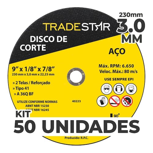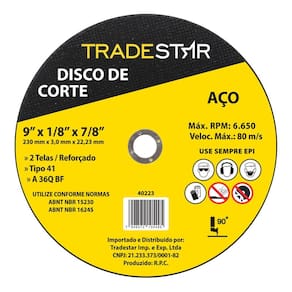 O Disco de Corte Metal 9" (230x3,0 mm) com Furo 22/23 mm é a ferramenta confiável que oferece cortes rápidos e precisos, garantindo resultados superiores em cada aplicação. Adquira agora e experimente a potência e a eficiência que farão a diferença em seus projetos de corte. Disco De Corte Para Aços » Indicado Para Corte De Aços. » 2 Telas/Reforçado. Tamanho: 9" (230mm) Espessura: 3,0 MM Furo: 22,23 MM Quantidade por embalagem – 50 unidades