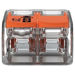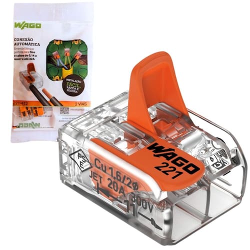 Conector de emenda; para condutores de até 4mm² com 2 entradas. Produto transparente e com alavancas laranjas. Temperatura máx. de operação 105ºC.