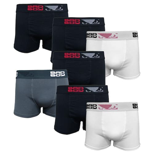 Kit contendo 7 cuecas Bad Boy modelo Boxer fabricada em Cotton 95% Algodão e elástico aparente personalizado de 40 milímetros. Modelagem jovem com lateral de aproximadamente 28 centímetros.