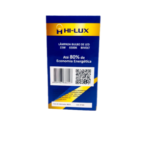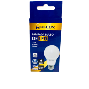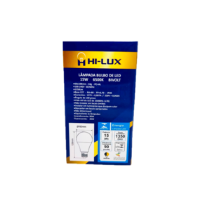 ¿ Base : E27 ¿ Tensão : Bivolt Automático 100V - 240V ¿ Ângulo de abertura : 180 graus ¿ Potência : 15W ¿ Fluxo Luminoso : 1350 Lumens ¿ Temperatura de cor : 6500K ¿ Emissão de cor : Branca ¿ Equivalência : Incandescente 75w / Fluorescente 20W ¿ Dimensões : 108mm x 60mm+-+ Marca: HI-LUX LED