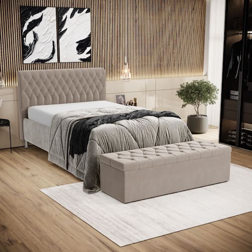 O Kit Bellatrix junto com a Calçadeira Sagitarius foi inspirada para você, que busca um alto estilo, design e um ótimo custo benefício. Ela possui detalhes em capitonê e um ótimo acabamento, junto com a calçadeira que possui um design único que dão um toque de sofisticação .O produto possui dois pés de 12 cm e 2 frames para a sustentação do box, não sendo necessário furar a sua cama, apenas encaixa-la nos suportes da cabeceira. Adquira já!