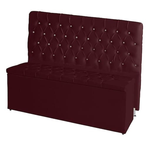 Ela vem em tecido courino e todo trabalhado em capitonê e ainda conta com lindos botões em strass que trás ainda mais beleza.