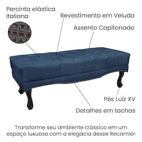 Tecido: VeludoEstrutura: Madeira EucaliptoDetalhes: Tachas em Metal FumêDensidade da Espuma da Cabeceira: D-23Montagem da Cabeceira: Acompanha manual de montagem, kit frame e parafusos para cama boxRecamier;Material dos Pés: Madeira MaciçaTipo de Pés: Pés Luiz XVDensidade da Espuma: D-26