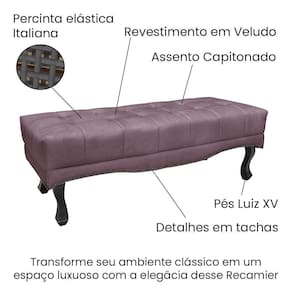 Tecido: VeludoEstrutura: Madeira EucaliptoDetalhes: Tachas em Metal FumêDensidade da Espuma da Cabeceira: D-23Montagem da Cabeceira: Acompanha manual de montagem, kit frame e parafusos para cama boxRecamier;Material dos Pés: Madeira MaciçaTipo de Pés: Pés Luiz XVDensidade da Espuma: D-26