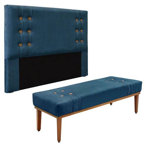 Kit Cabeceira e Calçadeira Recamier Solteiro 0,90m Gênova Veludo - Pallazio - Azul Marinho