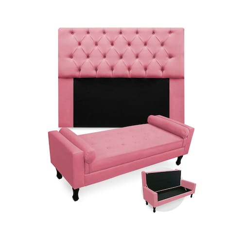 Kit Cabeceira Estofada Mirage E Recamier Baú Fenix Queen 160 cm Suede Rosa Barbie - LM DECOR