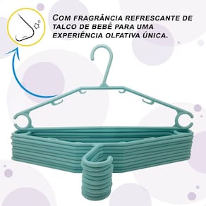 Kit cabide color cor:verde bebê;unidades:20 un kit de cabide preto em polipropileno - organização, estilo e fragrância refrescante de talco de bebê Você está em busca de um kit de cabide que ofereça organização, estilo e uma experiência olfativa única para o seu guarda-roupas Apresentamos o kit de cabide preto em polipropileno, o único no brasil com um aroma agradável de talco de bebê, proporcionando uma sensação de frescor e suavidade a cada uso Características do produto: