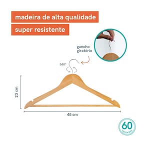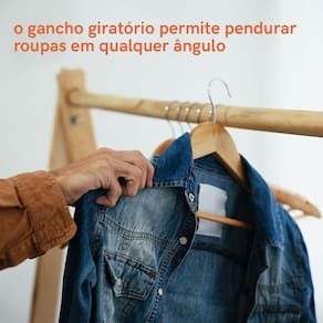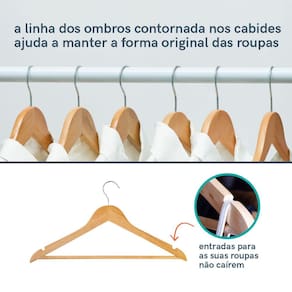 Bacana para segurar aquelas roupas pesadas como as blusas de frio, por exemplo. Com um design clássico, atemporal e corpo resistente, ele não marca o tecido e vem com gancho giratório, sendo uma mão na roda naquele momento que percebemos ter guardado a roupa pelo lado errado. A textura natural da madeira também ajuda a compor a decoração de ambientes abertos como uma arara, por exemplo.