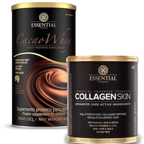 Benefícios whey protein hidrolisado e isolado 22 gramas de proteína por porção peptídeos de colágeno contém naturalmente bcaa e glutamina em sua composição sem adoçantes artificiais sem açúcar sem glúten sem lactose certificação de qualidade ifit sem conservantes ajuda na recuperação muscular melhor performance como consumir recomenda-se misturar uma 1 colher medida ou um sachê de 30 gramas que fornece 22 gramas de proteína em aproximadamente 300ml de água gelada e misture até total homogeneização, antes ou após atividade física, conforme orientação do médico ou nutricionista collagen skin natural 330g - essential collagen skin é um produto proteico, fonte de peptídeos bioativos de colágeno, ácido ortosilícico biodisponível e vitaminas a, c e e - nutrientes importantes e necessários para a formação e proteção do colágeno da pele. Não contém açúcar, lactose e glúten. Benefícios possui ação rejuvenescedora da pele de dentro para fora minimiza a formação de rugas, flacidez e linhas de expressão favorece a elasticidade e hidratação da pele contém nutrientes para uma pele bonita, jovem e saudável auxilia na proteção dos ossos e articulações como consumir adicione uma 1 colher medida 10g em aproximadamente 200ml 1 copo da bebida de sua preferência e misture até a total homogeneização. Beba imediatamente após o preparo. Ingredientes peptideos de colágeno, peptideos bioativos de colágeno, ácido ortosilícico, vitamina c revestida, tocoferol, vitamina a acetato, aromatizante idêntico ao natural de cranberry, antiumectante dióxido de silício, aromatizante natural extrato de cranberry, acidulante ácido cítrico, edulcorantes estévia e taumatina.
