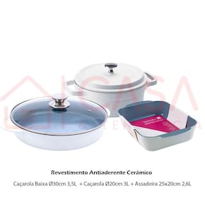 - Capacidade: 3,5 Litros - Tamanho: 3,5 Litros 30x6cm - Corpo Em Alumínio Fundido - Antiaderente Cerâmico - Pintura Resistente A Altas Temperaturas - Tampa de Vidro - Pode ir ao Forno e Lava Louças - Fundo Especial Para Todos Os Tipos De Fogão Fogão Convencional a gás, Indução e Halogênio - Cor: Branca