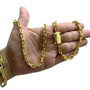 Kit Cadeado 7mm Fecho 750 Banhado a Ouro 18K Detalhes do Produto: Material: ligas metálicas de alta qualidade, especialmente tratadas para fixação e absorção do ouro, com acabamento em verniz protetor. Aparência: visual idêntico ao ouro maciço. Produção: artesanal, com atenção meticulosa aos detalhes. Banho: 10 camadas espessas de ouro 18k, finalizadas com verniz antialérgico . Elos: soldados varia conforme o modelo . Pedras: zircônias brilhantes cravejadas quando aplicável . Tamanhos Disponíveis: Cordões Masculinos: 70cm padrão e 60cm sob consulta/Pedido Via Chat . Cordões Femininos: 50cm padrão e 45cm sob consulta/Pedido Via Chat . Pulseiras: 21cm padrão ; tamanhos de 18cm a 23cm sob consulta/Pedido Via Chat. Pingentes: conforme imagens; consulte para mais detalhes via chat. Espessuras Recomendadas para Cordões / Pingentes: P: 1mm a 4mm M: 4mm a 8mm G: 6mm a 13mm Gg: 12mm a 18mm Incluso na Compra: Saquinho de organza para armazenamento seguro. Caixa elegante, perfeita para presente. Cupom de desconto para a próxima compra. Flyer com outros produtos da coleção. Carta de agradecimento personalizada. Adesivo da marca ToJoia18k. Informações Adicionais: : 6 meses termos acompanham o produto . Devolução: 7 dias para devolução sem questionamentos. Envio: despacho em até 24 horas úteis após confirmação do pagamento. Cuidados com a Peça: Evite contato com produtos químicos; aguarde o perfume secar antes de usar. Evite contato com shampoo, condicionadores e suor excessivo. Armazene em local seco, preferencialmente no saquinho de organza fornecido. Uso no mar e piscina é permitido; lave com água corrente e sabão neutro após. Por que Escolher a ToJoia18k Semi-joias luxuosas que combinam estilo, qualidade e sofisticação. Banho espesso de ouro 18k, garantindo brilho duradouro e acabamento impecável. Design exclusivo e produção artesanal, perfeitos para qualquer ocasião. Materiais premium que asseguram durabilidade. Ao escolher uma semi-joia ToJoia18k, você investe em qualidade, elegância e uma experiência única. Aguardamos sua compra Observação: pode ocorrer variação no fecho raramente . Imagens reais, sem edição. Qualquer dúvida, estamos à disposição para esclarecimentos. Marca: Não Informado