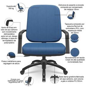 Com rodas: Sim | OriginCountry: Brasil | Cor: Azul | ColorSimple: Azul | Color: Azul | ProductLength: 73 cm | Modelo: Magno | Modelo detalhado: Magno Fixa e Magno Giratória Base Preta | Model: Magno | SupplierSimpleName: Kit Cadeira de Escritório Giratória e 2 Cadeiras Fixas Preta Magno P03 Crepe Azul - Lyam Decor | OriginState: PR | SizeDescription: Altura: 115 cm x Largura: 71 cm x Profundidade: 73 cm | Tipo de cadeira de escritório: Cadeira Giratória Operativa Plus Size | Formato de venda: Kit | Material do estofamento: Crepe | Material: Base Giratória de Aço Carbono, Espuma Flexível Poliuretano, Crepe | ProductWeight: kg | Com apoio de braços: Sim | ColorFamily: Azul | ColorSupplier: Azul | Requer montagem: Sim | Com aro para pés: Não | MaterialFamily: Crepe | ProductWarranty: 90 dias após o recebimento do produto | ProductWidth: 71 cm | Materiais do aro para pés: na | Número de registrocertificação INMETRO: ABNT NBR 13962, NR 17 | ProductContents: 02 Cadeiras Fixas, 01 Cadeira Giratória, manual de instruções | ProductInstructions: Produto para uso em ambiente interno, nao devendo ficar exposto ao sol, calor e umidade excessivos. | ProductHeight: 115 cm