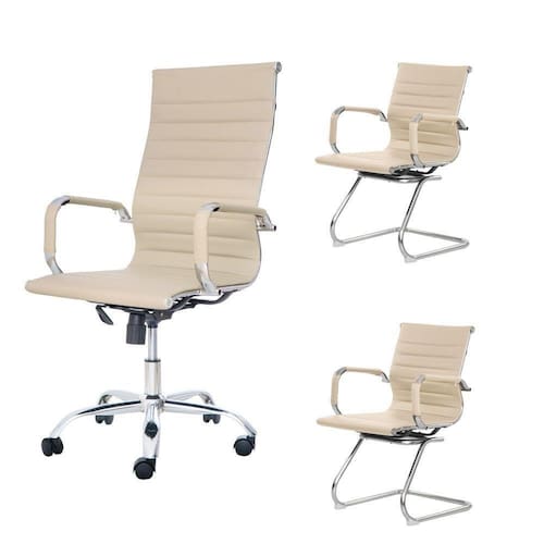 Kit Cadeira De Escritório Presidente Stripes + 2 Cadeiras Interlocutor Fixa Nude Office Modelo: Cadeira Escritório Stripes Presidente PU Nude Assento: Estrutura Revestida em Pu Base: Aço Cromado Profundidade: 64 cm Largura: 54 cm Altura Total: Alta 117 cm - Baixa 107 cm Altura do Chão Até o Assento: Alta 58 cm - Baixa 48 cm Altura do Chão Até o Braço: Alta 81 cm - Baixa 71 cm Medida Interna do Assento Profundidade Interna do Assento: 47 cm Largura Interna do Assento: 45 cm Peso Máx. Recomendado: 120 kgs Modelo: Cadeira Escritório Stripes Fixa Nude Assento: Estrutura Revestida em PU Base: Aço Cromado