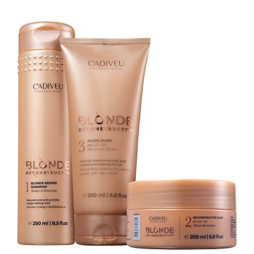 O Kit Cadiveu Blonde Reconstructor Care foi especialmente desenvolvido para para combater de forma os principais problemas do cabelo descolorido, que são: quebra, frizz, porosidade, amarelamento e esverdeamento por piscina.