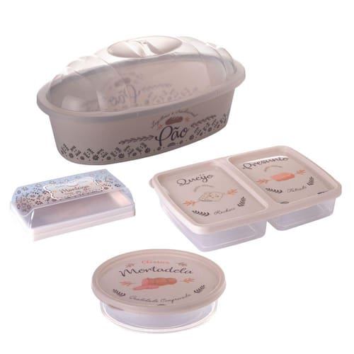 Kit Café da Manhã e Chá da Tarde para cozinha e mesa composto por 8 peças.Serve PãoMaterial: PolipropilenoDimensões: 34cm X 19,3cm X 15cm (CxLxA) Porta Frios com 2 DivisóriasMaterial: PolipropilenoDimensões: 24,2cm X 17,5cm X 4,8cm (CxLxA) Porta MortadelaMaterial: PolipropilenoDimensões: 19,2cm X 18,8cm X 5cm (CxLxA) ManteigueiraMaterial: PolipropilenoDimensões: 15,9cm X 8,5cm X 4,5cm (CxLxA)