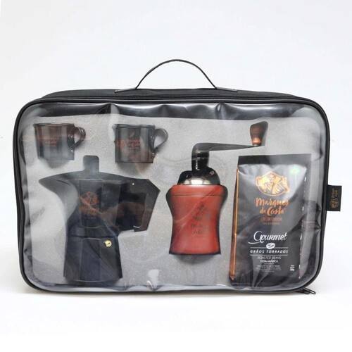 Kit Café Especial Moinho Manual de Madeira + Cafeteira Italiana + 2 Xícaras + Café Gourmet Grão 500g + Bolsa