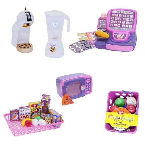 O kit vem com caixa registradora com dinheirinho e mercadinho com frutas, legumes e comidinhas, cafeteira e liquidificador, microondas