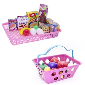 - 1 caixinha de suco de uva, - 1 caixinha de leite integral, - 1 caixinha de sucrilhos, - 1 caixinha de macarrão instantâneo, - 1 caixinha de cookies de chocolate, - 2 ovos - 2 pimentões - 1 banana. - 1 lata de milho - 1 lata de toddy - material: plástico e papelão - 1 cestinha