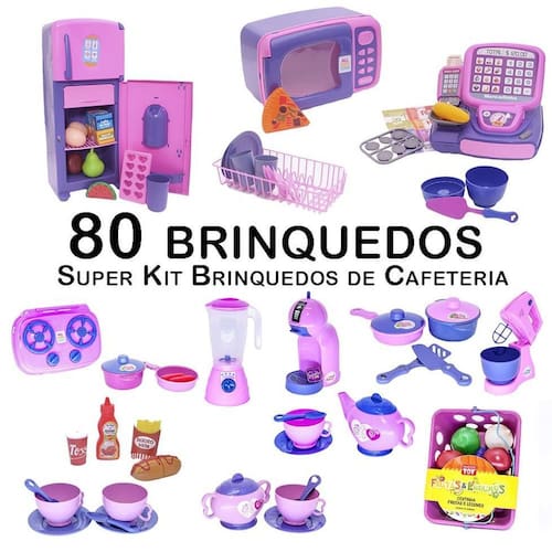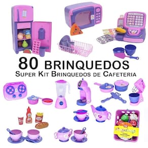 o kit vem com caixa registradora com dinheirinho e mercadinho com frutas, legumes e comidinhas, cafeteira e liquidificador, microondas, xícara com pires e colher, bulê, açucareiro, batedeira, escorredor com louça, geladeira com acessórios, jogo de panelas com acessórios , forminhas com acessório