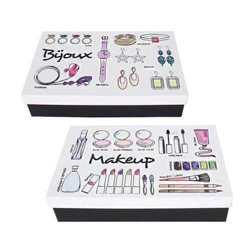Kit Caixa De Maquiagens + Caixa de Bijoux - GegutonCaixa De Bijuterias Minhas Bijoux - Geguton Moderna e com muito estilo, essa caixa foi desenvolvida com divisórias internas para organizar de maneira fácil e prática acessórios e bijoux: brincos, anéis, pulseiras, colares, relógio, a tampa abre com dobradiças. Produto de aço fabricado no Brasil. A Coleção Beauty é inspirada nas mulheres apaixonadas por maquiagens e acessórios, que curtem moda e beleza, arrasam no look e são uma inspiração para outras mulheres. Sugestão de presente para quem adora se enfeitar. As joias, bijoux não acompanham o produto. Largura:30,9 cm Profundidade:19,0 cm Altura:7,2 cm Capacidade:N/A Composição/Material:Chapa de aço, pintura epóxi. Conteúdo da Embalagem:1 caixa. Embalagem:plástico Termo Encolhível. Instruções de Conservação:Limpar com pano levemente umedecido, não utilizar solventes e abrasivos.Dicas de Uso:Produto indicado para áreas internas Somos gratos por ter você aqui Aguardamos sua compra.