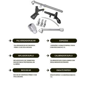 Kit de Acessórios para Compressor de Ar - Completo para Diversas Aplicações Este kit completo de acessórios para compressor de ar é ideal para quem busca versatilidade e eficiência em suas atividades diárias. Inclui: 1 Ferramenta de aplicação de ar com bico curto 1 Ferramenta de aplicação de ar com bico alongado 3 Conectores engate rápidos macho 1 Engate Rápido 1/4 com rosca 1/4 1 Inflador 150mm com rosca 1/4 1 Calibrador Pneu 150 Lbs Caminhão Profissional Aplicações: - Limpeza de superfícies e equipamentos Encher pneus e infláveis Conectar e desconectar mangueiras de ar rapidamente Compatibilidade: ideal para uso em oficinas, garagens e indústrias Compatível com a maioria dos compressores de ar disponíveis no mercado Características: alta resistência e durabilidade Fácil de usar e instalar Versatilidade para diversas tarefas Garanta já o seu kit e otimize suas atividades com ferramentas de qualidade e confiabilidade. Ideal para quem busca eficiência e praticidade no dia a dia. Marca: Não Informado