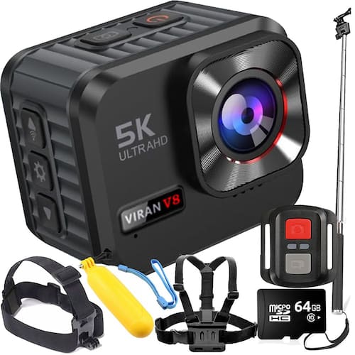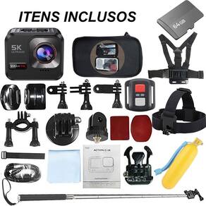 Kit Câmera De Ação VIRAN V8 5k 64gb Controle Wifi Estabilizador Bastão Boia Suporte Peito e Cabeça - PRETO