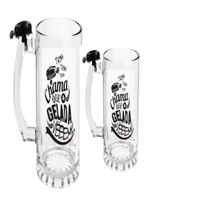 Especificações do Produto:Capacidade: 450ML Perfeita para servir chopp, cerveja ou a bebida de sua ões:Altura: âmetro: 7,5cm.Material: Vidro resistente e durá Inclusos: 2 Canecas de vidro com campainha.