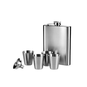 Feito em material resistente e durável, o cantil tem capacidade para 230ml, permitindo que você carregue sua bebida favorita com segurança e estilo. Além disso, o kit inclui um mini funil, facilitando o preenchimento da garrafa e dos copos shot.