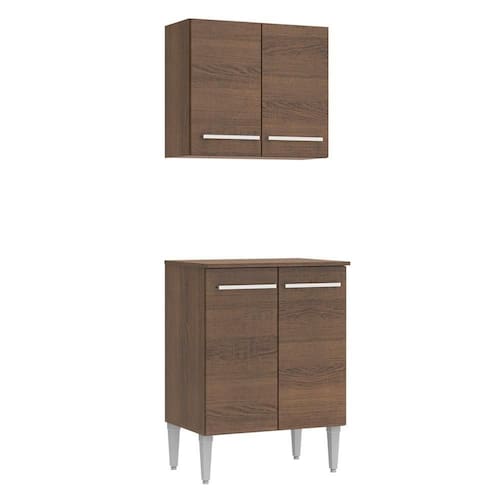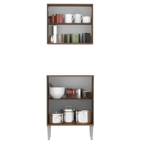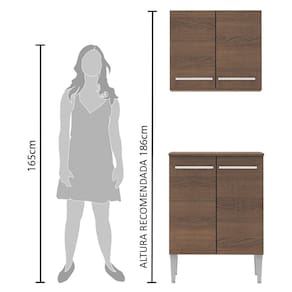 - Tanto o armário aéreo quanto o balcão possuem dobradiças metálicas resistentes e puxadores com alumínio.