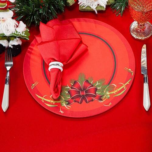 Kit Capa De Sousplat Estampado Natalina C/ Guardanapos Mesa Posta Jogo Americano 06 Lugares - Decoração Natal Cor Laço Vermelho