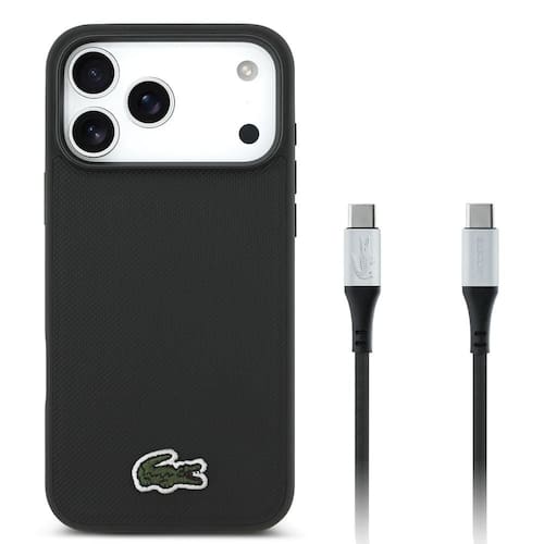 Especificações Traseira em PVC + Petit Piquet Logo Lacoste bordado na traseira Bordas em TPU para absorção de impacto Proteção elevada para câmera em metal Botões metálicos reforçados Perfil slim e peso leve Drop protection contra quedas e arranhões Encaixe rápido Pegada confortável Compatível com carregamento por indução Embalagem sustentável Cabo USB-C de 1,5m em nylon trançado com ponteiras de alumínio Carregamento rápido
