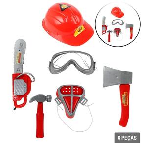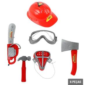 KIT Capacete Bombeiro e Acessórios 06 Pçs P hame os pequenos combatentes do fogo! Com o Kit Bombeiro, a criançada vai se sentir parte de uma verdadeira equipe de resgate. Completo com capacete temático e acessórios essenciais, o kit promove brincadeiras criativas, cheias de ação e imaginação.\nFeito em plástico leve e resistente, é ideal para crianças que adoram brincar de faz de conta, participar de festas temáticas, apresentações escolares ou simplesmente se divertir em casa com aventuras heróicas.\nEspecificações:\nMarca : DDG\nTipo de material : Plástico\nCores ou Estampa : Color\nDimensões do Produto : 12 X 23 X 18 CM\nDimensões da Embalagem : 12 X 23 X 18 CM\nPeso Bruto (Gramas) : 0.184 Marca: Não Informado