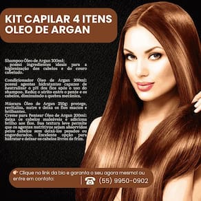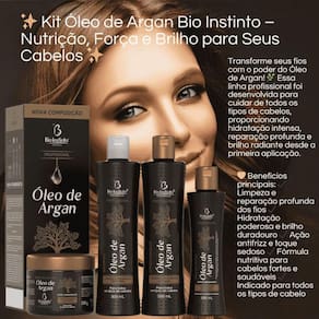 Descubra o poder do Kit Capilar 4 Itens Óleo de Argan Bio Instinto, sua solução completa para cabelos macios, hidratados e revitalizados. Formulado com óleo de argan 100% natural, este kit proporciona nutrição intensa, reparação profunda e brilho duradouro, ideal para todos os tipos de cabelo.