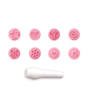 Kit carimbos essenciais (1,5cm). São oito opções de carimbos que combinam com diversos temas ideias para tornar suas decorações mais delicadas, acompanha um cabo que encaixa e facilita no momento de utilizar. Aplique de forma rápida e prática em seus doces, experimente carimbar com pó ou glitter e destaque ainda mais os desenhos. Eleve o nível de seus trabalhos, lembrancinhas, decorações e surpreenda seus clientes!