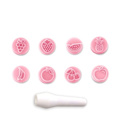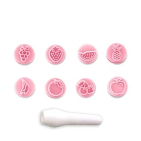 Kit carimbos frutas (1,5cm). São oito opções de carimbos para tornar suas decorações mais divertidas, acompanha um cabo que encaixa e facilita no momento de utilizar. Aplique de forma rápida e prática em seus doces, experimente carimbar com pó ou glitter e destaque ainda mais os desenhos. Eleve o nível de seus trabalhos, lembrancinhas, decorações e surpreenda seus clientes!
