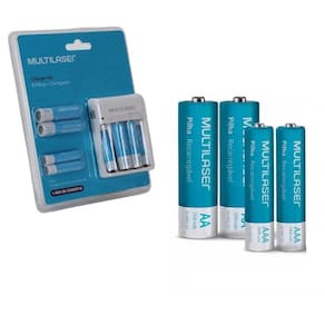 Kit Carregador De Pilhas Com 8 Pilhas Multilaser - Cb093Carregador de Pilhas Multilaser 4 X AA+ 4 X AAA - 12 Horas - CB093 Carregador Multilaser Aa/Aaa + 4 Pilhas Recarregável 2500Mah Pare de sofrer com a falta de pilhas, nos momentos em que você mais precisa, principalmente nas partidas de Games Ou mesmo em seu trabalho home office com seu teclado ou mouse. Você terá pilhas com carga, a hora que você desejar. Pack com 4 pilhas recarregáveis Multilaser CB054 tipo AA de 2500 mAh, ideais para uso em máquinas digitais, mouse e teclado sem fio, controles de videogames, etc... Podem ser recarregadas mais de 1000 vezes gerando grande economia e conveniência. O tempo de carga varia de acordo com o carregador utilizado. Pilhas recarregáveis Multilaser AA, uma excelente opção para economia e para o meio ambiente, vário equipamentos eletrônicos necessitam de pilhas para o seu funcionamento. Como por exemplo as câmeras fotográfica, principalmente as profissionais que não podem ficar descarregadas no meio de um evento. Controle do Xbox, alguns equipamento médicos. Pensando nisso, a Multilaser trouxe um kit com 4 pilhas recarregáveis. Carregador leve, compacto e fácil de usar. Ideal para viagens e eventos onde você não pode se preocupar em gastar pilha. Com tempo aproximado de recarga de 10 horas para pilhas AA 2500mAh e apenas 4,5 horas para as AAA 1000mAh. As Pilhas Recarregáveis AA 2500mAh e AAA 1000mAh podem ser utilizadas em qualquer aparelho que use o formato AA e AAA. Carregue-as quando necessário para ter sempre em mãos pilhas com cargas, evitando precisar correr atrás de última hora. Informações Técnicas: Carregador compatível com pilhas: AAA e AA Energia: Bivolt Quantidade: 1 Carregador Fabricante: MULTILASER Aprovada pelo INMETRO Pilhas Material: Nimh, cobre Bateria: 2500 Mah Itens inclusos: -1x Carregador de Pilhas 110v/220v - Bivolt -4x Pilhas AA 2500 Mah