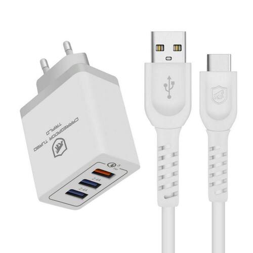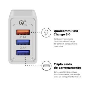 Carregador Turbo com tripla saída e cabo Type-C reforçado com presilha organizadora.Acabamento do material